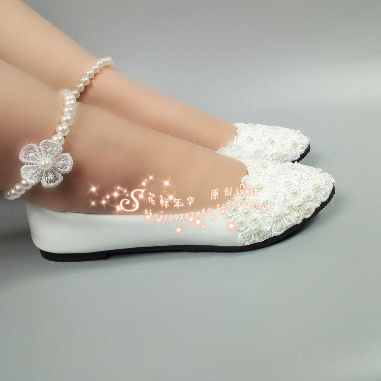 蕾丝花朵珍珠婚鞋平底新娘低跟孕妇婚纱摄影拍照伴娘一字扣绑带女热门设计联盟服务商